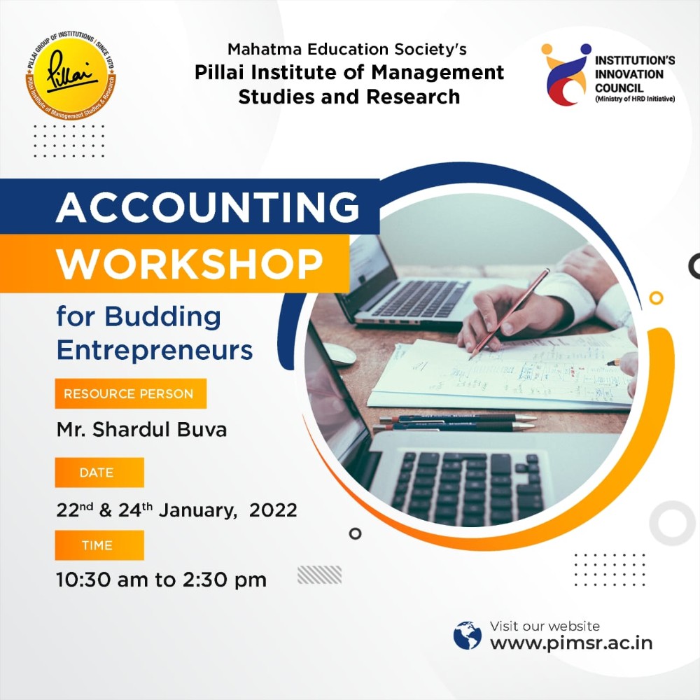 The Institution Innovation Council of Pillai Institute of Management Studies and Research organized a workshop titled “Accounting Workshop for Budding Entrepreneurs” for the participants of the Business Plan Competition 2021-22. The session was conducted by Dr. Shardul Buva on 22nd and 24th January, 2022 for a total duration of 8 hours. The course was designed to provide the participants with basic knowledge and understanding of introductory accounting terminology, techniques, and principles. The objective of the course was to develop a general understanding of financial reports and help the students prepare basic projected financial statements for their businesses. Dr. Buva familiarized the students with simple accounting principles as well as the basic relationship between assets, liabilities, and owner’s equity. 20 students and three faculty members of PiMSR actively participated in the sessions on both days. The session had a lot of class exercises to check their learning outcomes. At the end of the session the students could create their own projected financials for their own startups. The workshop was interactive and enriching for all.
