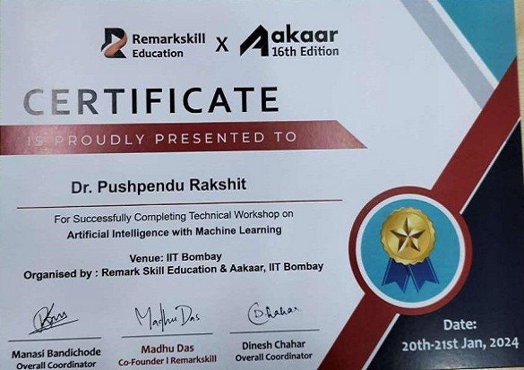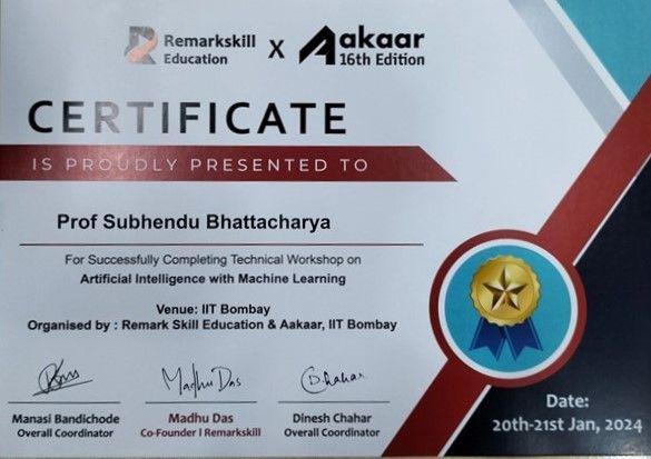 Recently, two of our distinguished faculty members, Prof. Subhendu Bhattacharya and Dr. Pushpendu Rakshit, participated in a 2-day intensive technical training program dated on 20th – 21st January, 2024 on Artificial Intelligence (AI) and Machine Learning (ML). The program, organized by Aakaar, IIT Bombay, brought together experts and educators to explore contemporary trends and applications in AI and ML.