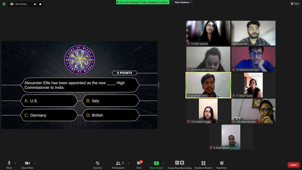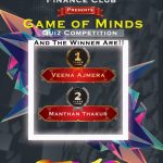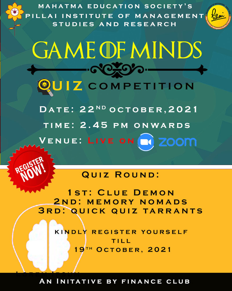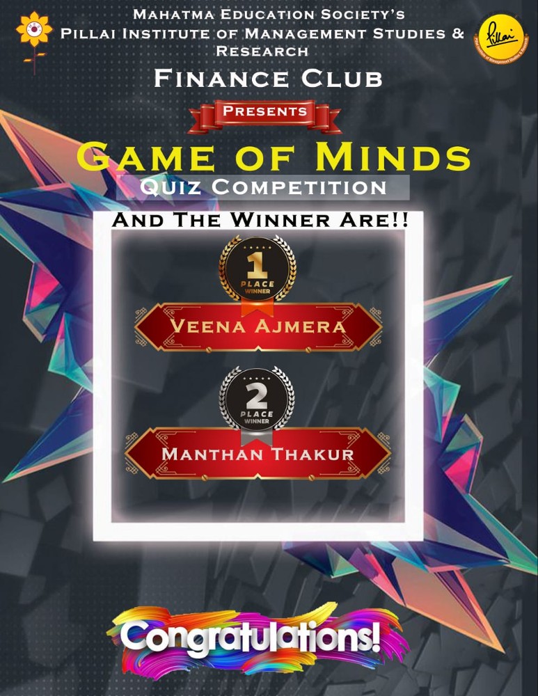 The Finance Club of Pillai Institute of Management Studies and Research organized an online event “Game of Minds” for all the management students on 22nd October, 2021. The event had two qualifying rounds ‘Club Demon’ and ‘Memory Nomads’ apart from the final round ‘Quick Quiz Tarrants’ organized on the day of the event. The entire event was a students driven activity that aimed at enhancing knowledge of the students in the field of finance.The event was a huge success with more than 80 participants. The event concluded with Ms. Veena Ajmera and Mr. Manthan Thakur as the winners.