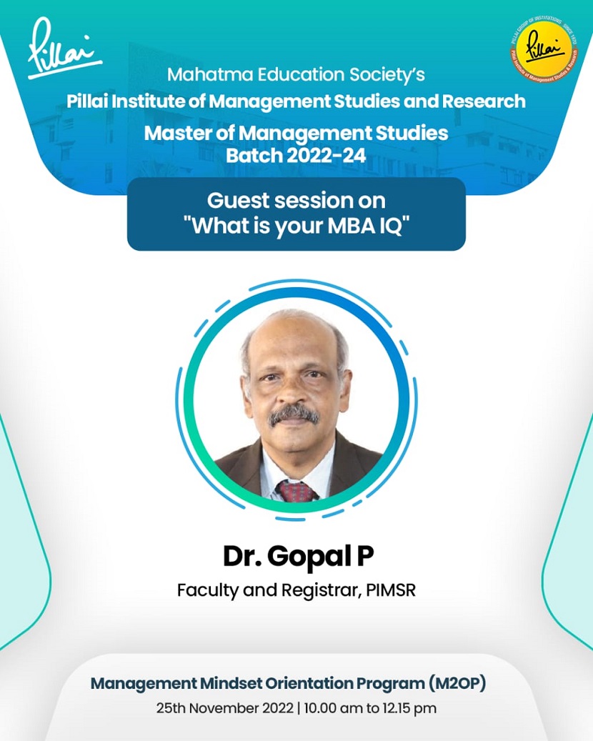 Prof. Gopal is the Registrar of Pillai Institute of Management Studies and Research and an entrepreneur. Prof. Gopal defined MBA IQ as the cognitive abilities that are necessary to excel in a MMS program. While the MMS program covers a wide range of subjects, including finance, marketing, and management, MMS IQ is not specific to any of these areas. Instead, it encompasses a broad set of skills, such as critical thinking, problem-solving and analytical reasoning, that are crucial for success in business. MMS IQ is also closely linked to emotional intelligence, which involves the ability to understand and manage one’s emotions, as well as those of others. While a high MBA IQ can be beneficial in many areas of business, it is not the only factor that contributes to success. Other factors, such as practical experience, networking and communication skills, are also important for achieving career goals in the business world.