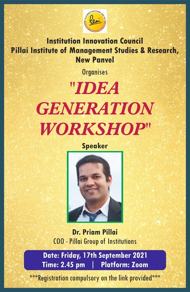 IIC of Pillai Institute of Management Studies and Research organised an Idea Generation Workshop by Dr. Priam Pillai – Founder of Valectus Pvt. Ltd. on Friday, 17th September, 2021. It was conducted as a prelude to the Business Plan Competition 2021-22 announced by the Pillai Centre of Innovation and Entrepreneurship. Dr. Priam Pillai is the Founder of Valectus Pvt Ltd, a geospatial analytics firm, that won the Maharashtra State Innovation Society’s startup award in 2020. He is the Chief Operating Officer of Mahatma Education Society’s Pillai group of institutions. He is the founding partner of the Urban Expansion Observatory, a joint research initiative in Geospatial technologies between Mahatma Education Society and New York University. He has a PhD in mechanical engineering from MIT. He founded the Pillai Center of Innovation and Entrepreneurship in 2015.