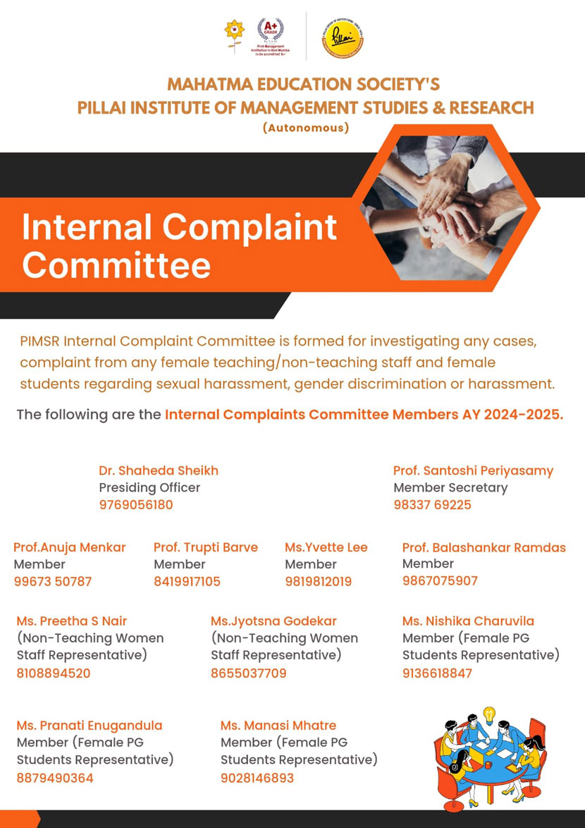 ICC (Internal Complaints Committee) of Pillai Institute of Management Studies and Research conducted a session with MMS students. Dr. Shaheda Sheikh Presiding officer and Prof. Santoshi Perysamy Secretary of ICC have briefed them about ICC Committee. The aim was to discuss and make students aware about the ICC objectives, to know about the members and the necessary steps to be taken in case of complaints or any other concerns.