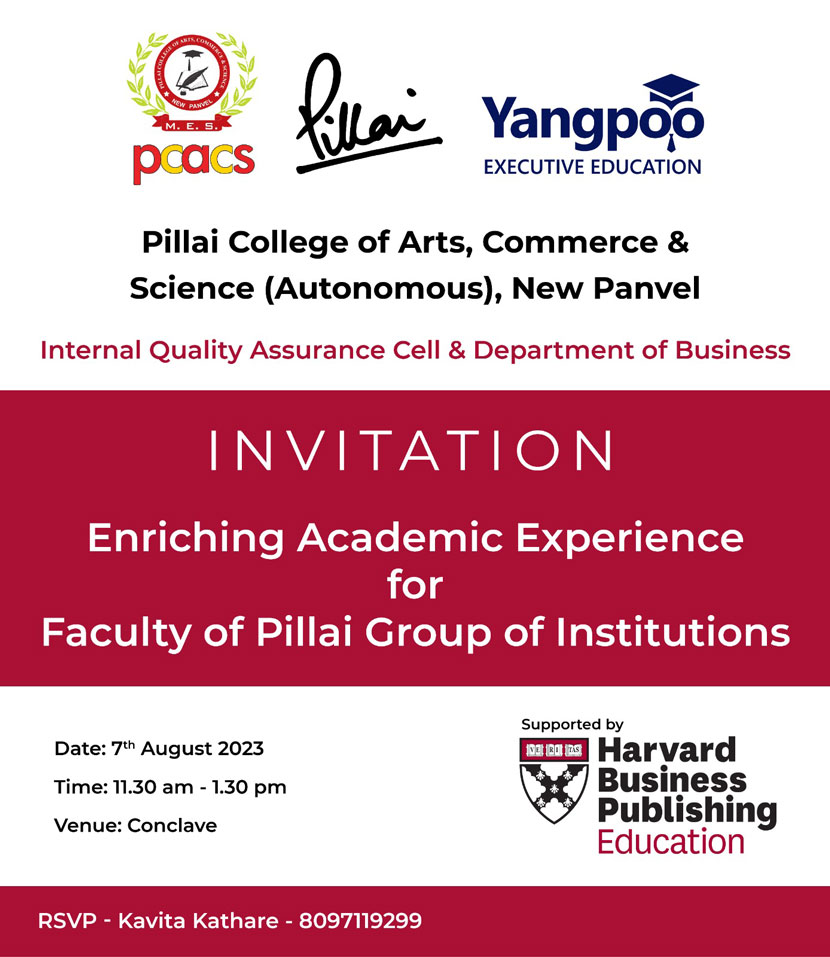 The Internal Quality Assurance Cell & Department of Business of Pillai College of Arts, Commerce & Science (Autonomous), New Panvel, organised the International Seminar on “Enriching Academic Experience for Faculty of Pillai Group of Institutions” on 7th August, 2023 from 11:30 am onwards. The seminar was inaugurated by Dr. Samir Karkhanis, CEO of Yangpoo Executive Education and Former Chief Marketing Officer of Welingkar Institute of Management, Mumbai and Mr. Kiran Surti. The Session focussed on how to bring academic rigour, interaction and engagement in the classroom by improving teaching techniques to develop corporate-ready students, how to develop tomorrow’s leaders through engaging business education, improve the practice of management and its impact on a changing world and educating leaders who will make a difference in the world. The key takeaways of the seminar were how to gain the respect of students by teaching more effectively, introducing innovative teaching tools like case studies & simulations from Harvard Business School and latest corporate readiness solutions to groom students. 19 faculty members of PIMSR attended the same.