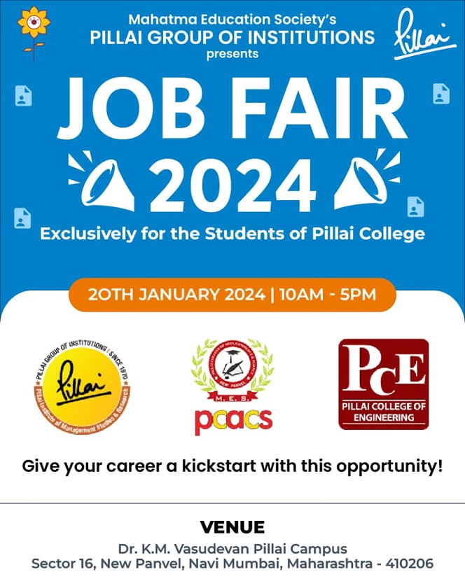 The Training and Placement Cell of Mahatma Education Society’s Pillai Institute of Management Studies and Research, Dr. K. M. Vasudevan Pillai Campus, in collaboration with the Training and Placement Cells of Pillai College of Engineering and Pillai College of Arts, Commerce, and Science hosted a significant event – JOB FAIR 2024 on 20th January, 2024.
