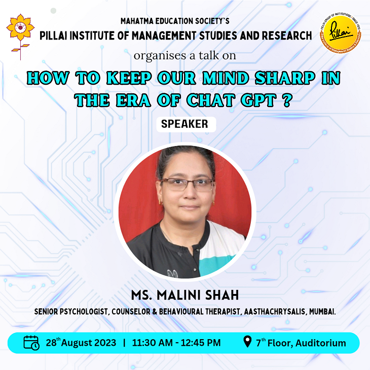 Ms. Malini Shah, Senior Psychologist, Counsellor & Behavioural Therapist at Aastha Chrysalis, Mumbai conducted a Session on “How to Keep Our Mind Sharp in The Era of ChatGPT?” on 28th August, 2023 at 11:30 a.m. 173 students attended the session. Ms. Malini Shah has an impressive career spanning over two decades in the fields of training and counselling, both in India and internationally. Ms. Shah is a Counsellor, Employee Assistance Professional, POSH Trainer and Behavioural Trainer. She is a certified trainer in presentation skills from Delta College, Michigan and also a certified trainer in Facilitation skills from Zenger Miller, Singapore and trainer in situational self-leadership from Ken & Blanchard, USA just to name a few. Additionally, she contributes to education as a member of the Raigad Education Society. Her areas of specialization encompass a diverse range of topics such as Personal and Professional Counselling, Communication and Conflict Resolution, Loss and Grief Counselling, Suicide Assessment and Prevention, Psychotherapy and Anger Management.