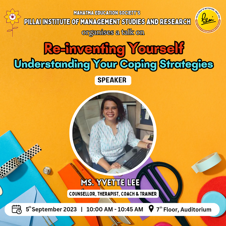 Ms. Yvette Lee, Counsellor at Mahatma Education Society’s Pillai Group of Institutions conducted a session on Reinventing Yourself – Learning Coping Strategies for the students pursuing management studies at PiMSR on 5th September, 2023 at 10 a.m. Ms. Yvette Lee is a counselor, therapist, coach and trainer. She has been working in the field of mental health for the last 14 years. Her expertise lies in mental health counseling, crisis, grief and trauma counseling and adolescent and marriage counseling. She has worked in the past with people living with mental illnesses and is currently associated with a group of schools and colleges in Mumbai and Navi Mumbai. She works with students with behavioral, emotional, psychological and academic difficulties.