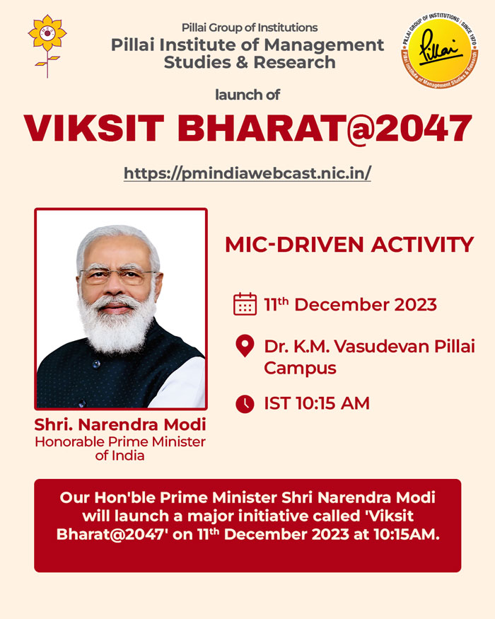 India’s Prime Minister Shri Narendra Modi launched a major initiative called ‘Viksit Bharat@20247’ on 11th December, 2023 at 10:15 a.m. The IIC of PiMSR organized a live telecast of the Viksit Bharat@20247 event at various classrooms so that participants watched the event live by joining in the Hybrid mode. The session began with Welcome / Introductory Remarks by Cabinet Secretary, Launch of Viksit Bharat @2047 Ideas Portal by Hon’ble PM and a Special Address by Hon’ble Prime Minister.
