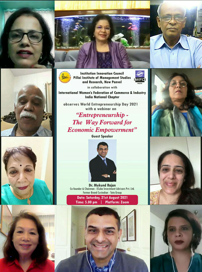 PIMSR’s Institute innovation Council (IIC) in collaboration with International Women’s Federation of Commerce and Industry India National Chapter conducted a Webinar to observe World Entrepreneurship Day on Saturday 21st August, 2021 at 5:00 p.m. on the theme titled “Entrepreneurship – The Way Forward for Economic Empowerment”. The Guest Speaker was Dr. Mukund Rajan, Co-founder and Chairman of ECube Investment Advisors Pvt. Ltd. and Former Brand Custodian of Tata Group. The purpose of the webinar was to learn about the problems and opportunities faced by an entrepreneur during their professional journey, the role of entrepreneurship in economic empowerment and various other facets of entrepreneurship.