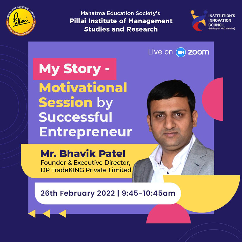 IIC of PiMSR organized a Webinar on “My Story – Motivational Session by Successful Entrepreneur” on 26th February, 2022 in a hybrid mode. The session was conducted by successful entrepreneur, Mr. Bhavik Patel. Mr. Patel is the Founder & Executive Director. DP TradeKING Private Limited, With more than seven branch offices in a year DP TradeKING has its Head Office in Anand, Gujarat which is also known as Milk City of India. He has achieved most prestigious title in Insurance Industry i.e. Multi Dollar Round Table (MDRT) by collecting premium of more than 40 Lakhs from one family. Thirty two students and four faculty members attended the same.