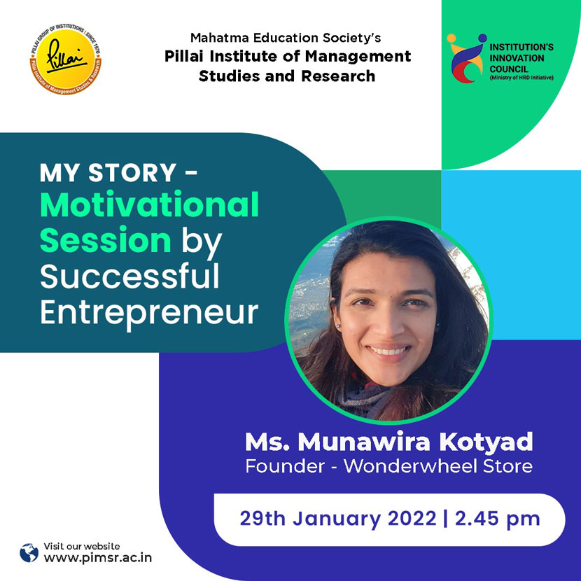 IIC of PiMSR organized a Webinar on “My Story – Motivational Session by Successful Entrepreneur” on 29th January, 2022 in an online mode. The session was conducted by successful entrepreneur, Ms. Munawira Kotyad. The objective of the session was to understand the opportunities and challenges of starting a business and get motivated to start some enterprise and become job creators Ms. Kotyad is the Founder of Wonderwheelstore.com, a platform for artists to reach customers directly. She is the Director at Pillai Centre of Innovation and Research and her interests lie in technological innovations and enterprises that are socially responsible. Having worked at INTEL and Microsoft as a software developer, she moved to India to work in academics and influence women and girls to participate in newly emerging technologies.