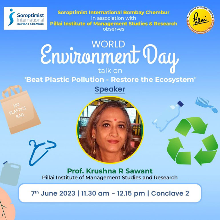 World Environment Day 2023 was celebrated by Mahatma Education Society’s Pillai Institute of Management Studies and Research in association with Soroptimist International Bombay Chembur on 7th June, 2023 at Dr. K. M. Vasudevan Pillai Campus, Prof. Krushna R Sawant conducted an interactive session in Marathi for the help staff of the Pillai Campus on the theme of preventing and navigating plastic pollution. The session was attended by 45 maavshis. During her session, Prof. Krushna R Sawant spoke about the harmful effects of pollution on the environment and the immediate need to curb the same. There was a discussion on various small steps that can be taken to reduce plastic waste. The participants actively participated and shared many of the practices they undertook to save the environment. The session ended with tea and snacks for all. The event was coordinated by Prof. Krushna R Sawant, Dr. Betty Sibil and Dr. Celina Joy.
